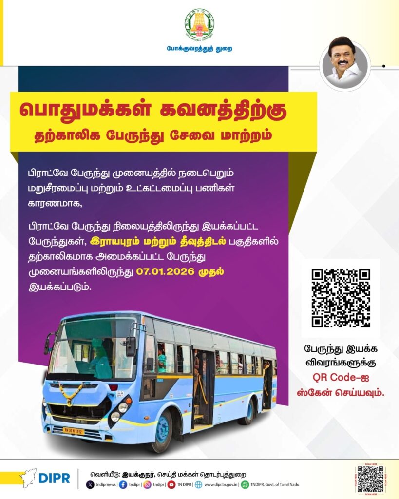 - 🚌 சில பேருந்து சேவைகள் தற்காலிக பாதைகளில் இயக்கப்படும்