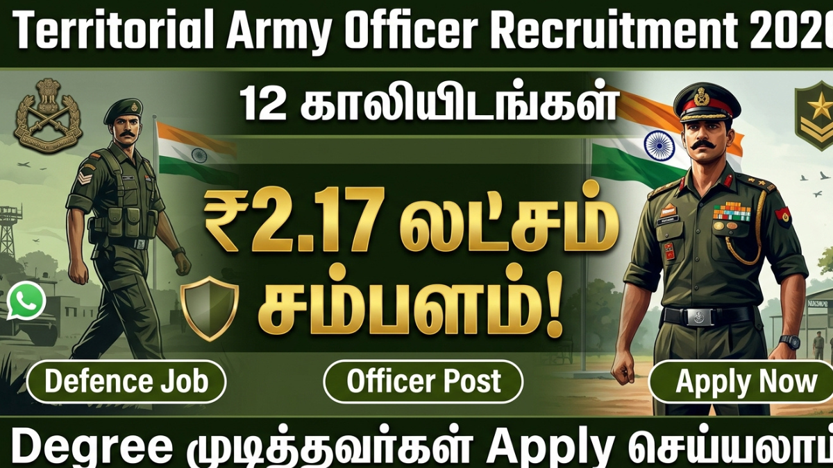 🔥 இந்திய இராணுவத்தில் Officer ஆக சேரும் Golden Chance! Territorial Army 2026 ஆம் ஆண்டிற்கான Officer பணியிடங்களுக்கு மொத்தம் 12 காலியிடங்களை அறிவித்துள்ளது. ₹2.17 லட்சம் வரை சம்பளம் + Defence Prestige கிடைக்கும் இந்த வேலைவாய்ப்பு மிக முக்கியமானது!