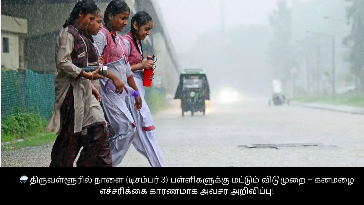🌧️ திருவள்ளூர் மாவட்டத்தில் நாளை (டிசம்பர் 3) பள்ளிகளுக்கு மட்டும் விடுமுறை – ஆட்சியரின் அவசர உத்தரவு!