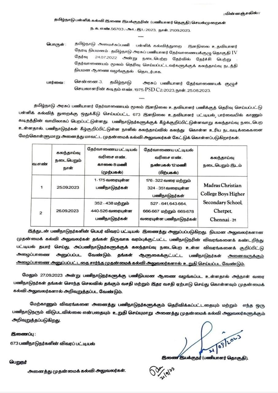 Recruitment Consultation for 673 Constables (Junior Assistant) selected by TNPSC and allotted to School Education Department on 25.09.2023 and 26.09.2023 – DSE Processes! – TNPSC மூலம் தெரிவு செய்யப்பட்டு பள்ளிக் கல்வித் துறைக்கு ஒதுக்கீடு செய்யப்பட்ட 673 பணிநாடுநர்களுக்கு (இளநிலை உதவியாளர்) 25.09.2023 மற்றும் 26.09.2023 ஆகிய நாட்களில் பணிநியமன கலந்தாய்வு – DSE செயல்முறைகள்!