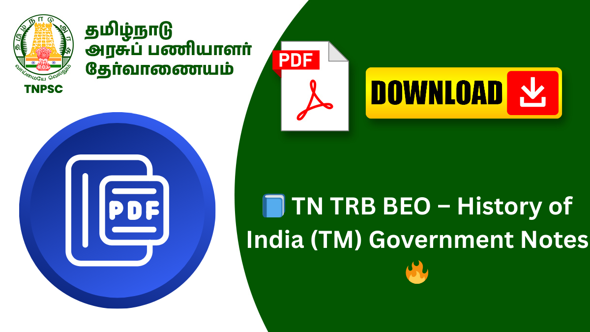 இந்த TN TRB BEO – History of India (Tamil Medium) Government Notes PDF-ல், இந்திய வரலாற்றின் முக்கியமான அனைத்து பகுதிகளும் exam-oriented முறையில் முழுமையாக தொகுக்கப்பட்டுள்ளன. TRB BEO தேர்வுக்கு History section மிக முக்கியமானது, அதுக்கேற்ப refined & simplified notes இதில் கொடுக்கப்பட்டுள்ளன.