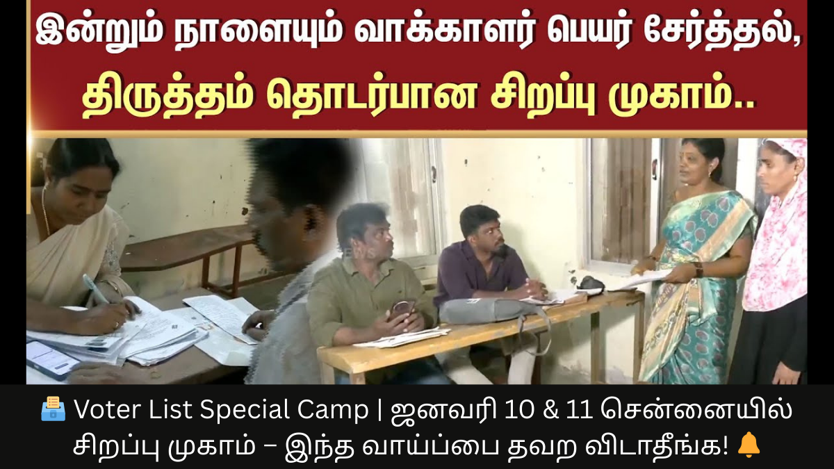 நாளையும், நாளை மறுதினமும் (ஜனவரி 10 & 11) சென்னையில் வாக்காளர் பட்டியல் திருத்த சிறப்பு முகாம் நடைபெற உள்ளது. 🗳️✅