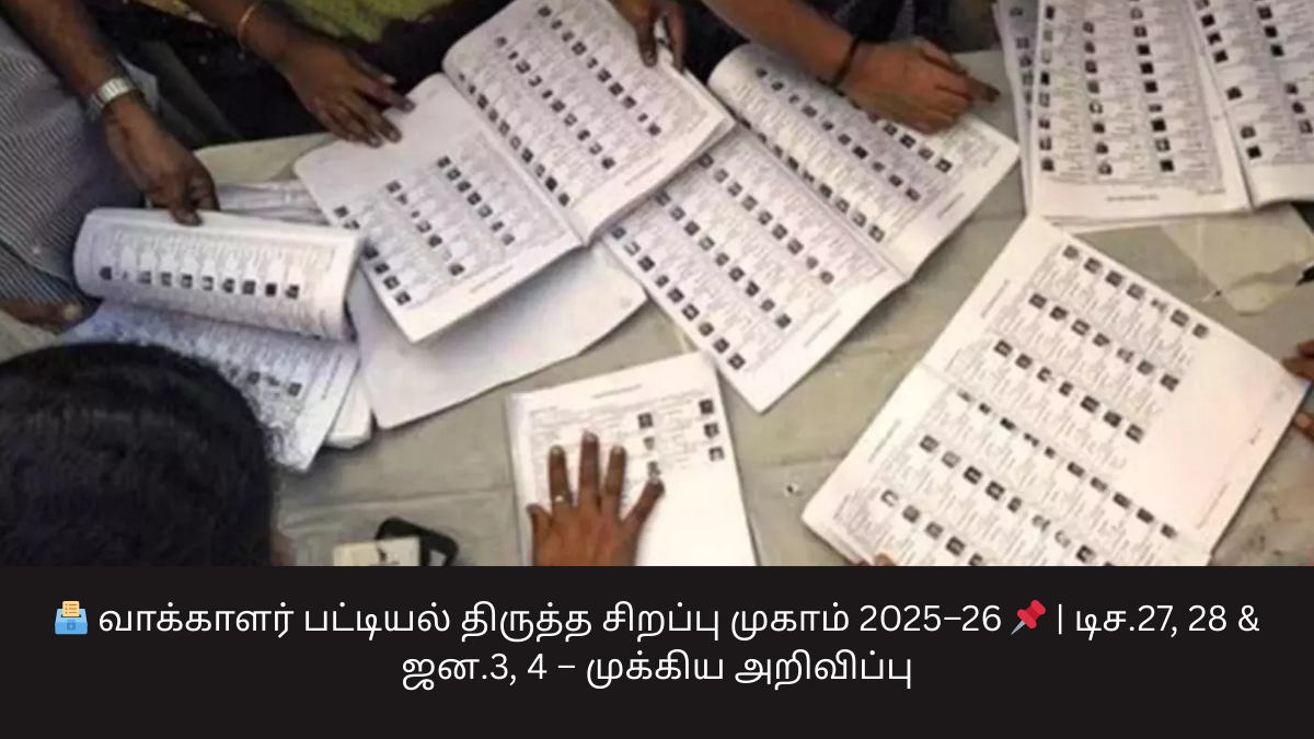 “2026 ஜனவரி 1-ம் தேதியை தகுதி நாளாகக் கொண்டு, வாக்காளர் பட்டியல் திருத்தத்திற்கான சிறப்பு முகாம்கள் அனைத்து வாக்குச் சாவடி மையங்களிலும் நடத்தப்படுகின்றன”