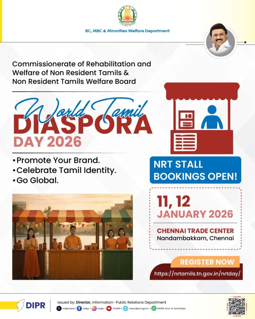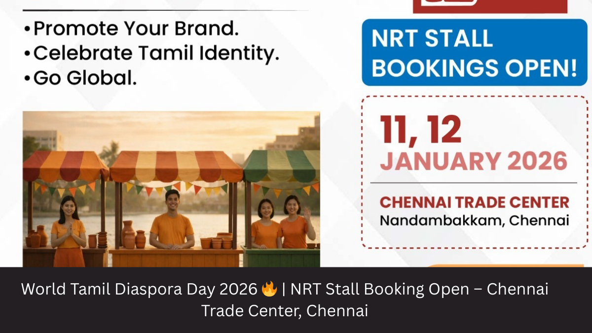 இந்த நிகழ்வின் ஒரு பகுதியாக, Non Resident Tamils (NRT) மற்றும் தமிழ் தொழில்முனைவோருக்கான Stall Booking தற்போது அதிகாரப்பூர்வமாக திறக்கப்பட்டுள்ளது.